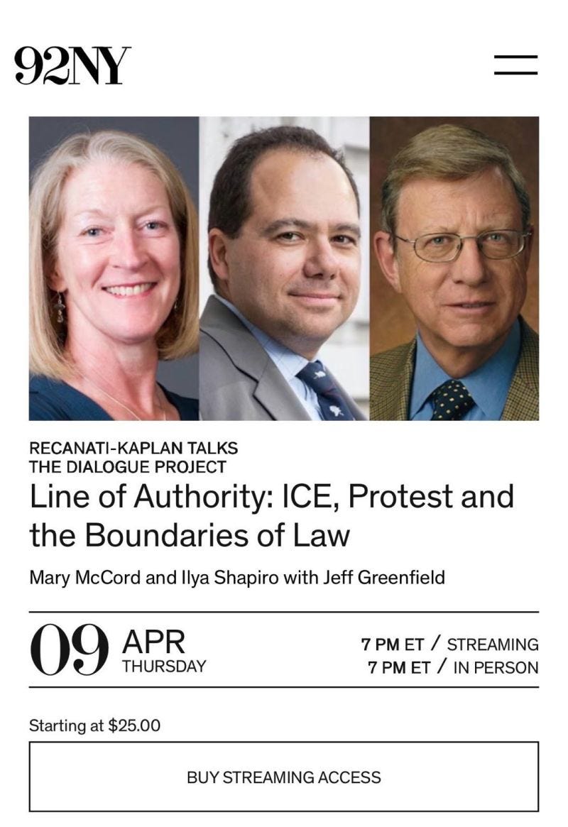 I was supposed to be in New York right now, speaking at the 92nd Street Y—a historic Jewish community center that has become known for its cultural programming. I knew that it had become a bastion of bien-pensant progressive virtue-signaling as befits its location on the Upper East Side of Manhattan, so was intrigued when early this year I was invited to speak there. It was to be a panel on immigration enforcement, protest, civil disobedience, and broader legal and political issues.